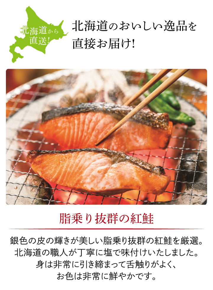 ●お腹が大きくまるまる太った、銀色の皮の輝きが美しい 脂乗り抜群の紅鮭を厳選し、北海道の職人が丁寧に塩で味付け いたしました。 ●荒波のなかを回遊してきた天然紅鮭なので、身は非常に引き締まって舌触り◎。 ●もちろん、着色料は一切使っていないのにも関わらず、 お色は非常に鮮やかです。 ●半身10切れ前後を使いやすく1切れごとに真空パックしています。 ●そのまま塩焼きで紅鮭を香ばしく味わうのはもちろん、 野菜やきのこ、味噌だれと一緒にホイル焼きしたちゃんちゃん焼きや、 鮭出汁のきいた石狩鍋、バター焼きなど、様々な料理にお使いいただけます。 |
