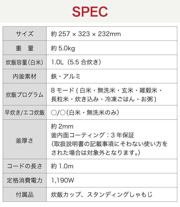 ●T-fal独自技法 遠赤外線×高火力IH! ・ふたには、新たに「セラミックプレート」を採用。 セラミックプレートをヒーターで熱し放出される「遠赤外線」と、 釜の下部からしっかりと包み込むように素早く加熱する「高火力IH」が 粒立ち、ハリ・甘みのあるおいしいご飯に炊き上げます。 ●ティファール独自の形状とこだわりの材質の釜で、さらに引き出すおいしさ! ・大きな熱対流を起こす炊飯に最適な球状釜。 ・発熱効率の良い「鉄」と熱伝導に優れた「アルミ」を組み込んだ、 蓄熱効果の高い約2mmの厚釜で、釜内を素早く均一に加熱します。 ・釜内面コーティングは3年保証(※)。 (※取扱説明書の記載事項に沿わない使い方をされた場合は対象外) ●毎日の炊飯に使いやすい炊飯プログラムは、 ・白米、無洗米、玄米、雑穀米、長粒米、炊き込み、冷凍ごはん、お粥の全8種類。 ・30分以内に炊き上げる「早炊き炊飯」&電気代節約につながる「エコ炊飯」搭載。 ・炊き具合は、やわらか、ふつう、かための3種類から選べます(※)。 (※白米・無洗米のみ。) ●お手入れもらくらく。 ・拭き取りやすいフルフラットトップパネル。 ・洗うパーツは内釜、鍋、蒸気口の3点だけ。 ・内ぶた、蒸気口(※)と付属のしゃもじ、カップは食洗機対応。 (※上部カバーは食洗機不可) ・炊き込みご飯を炊いた後などの気になる匂い残りを抑える「洗浄機能」搭載。 ●マットな質感でどんなキッチンにも合わせやすい、 ホワイトとブラックの2色展開。 |