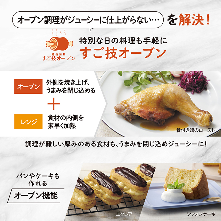 レンジで食材の芯まですばやく熱を通し、その後はグリルでこんがり調理など、