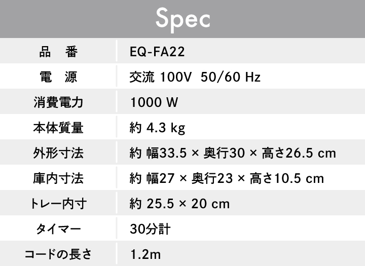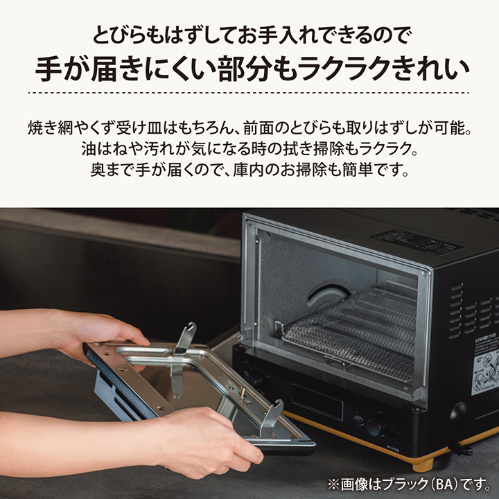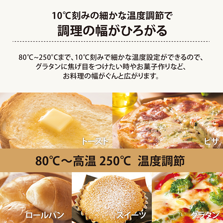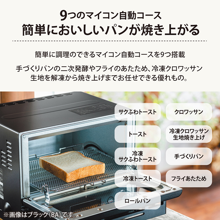 ●食材の温度を検知し、自動で温度調整しながら焼き上げる、 便利な9つの「マイコン自動コース」を搭載。 9つの専用コースを選ぶだけで、手間なくおいしく仕上がります。 1.サクふわトースト 2.トースト 3.冷凍サクふわトースト 4.冷凍トースト 5.ロールパン 6.クロワッサン 7.冷凍クロワッサン生地焼き上げ 8.手づくりパン 9.フライあたため ●外はサクッと、中はふんわりとした絶妙な食感のトーストに仕上げる! 「サクふわトースト」コース&「冷凍サクふわトースト」コース 上手に焼き上げができる「冷凍クロワッサン生地焼き上げ」コース ●10℃刻みの細かな設定ができる「80℃~250℃ 温度調節」 ●忙しい朝にサッと作れるものからこだわりのメニュー、 子供と一緒にお料理を楽しめるものまで、あなたの暮らしに寄り添う15のレシピを掲載。 ●焼き網をはずしてつまみをスライドするだけで、簡単にとびらがはずせます。 とびらの裏側や本体との隙間など、汚れやすく手が届きにくい部分も サッとお手入れできます。 |