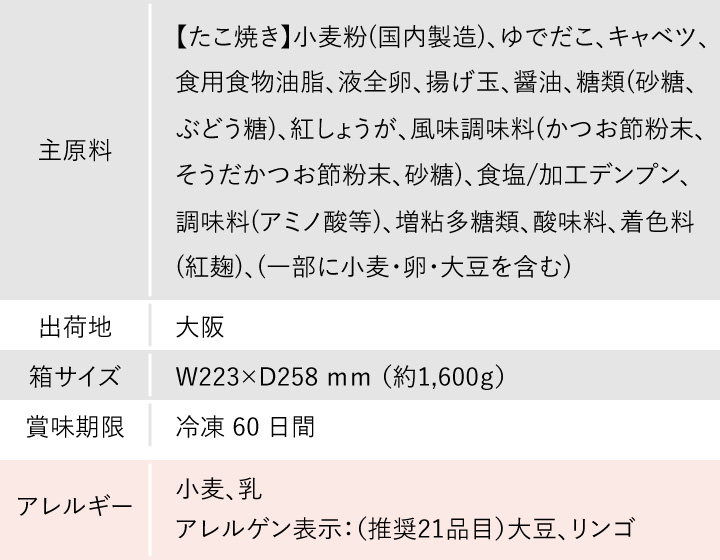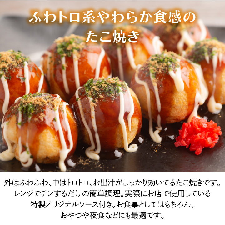 2026年3月20日までの期間限定販売! ●外はふわふわ、中はトロトロ、お出汁がしっかり効いてる 「ふわトロ系やわらか食感」のたこ焼きです。 ●レンジでチンするだけの簡単調理。 ●実際にお店で使用している特製オリジナルソース付き。 ●お食事としてはもちろん、おやつや夜食などにも最適です。 |