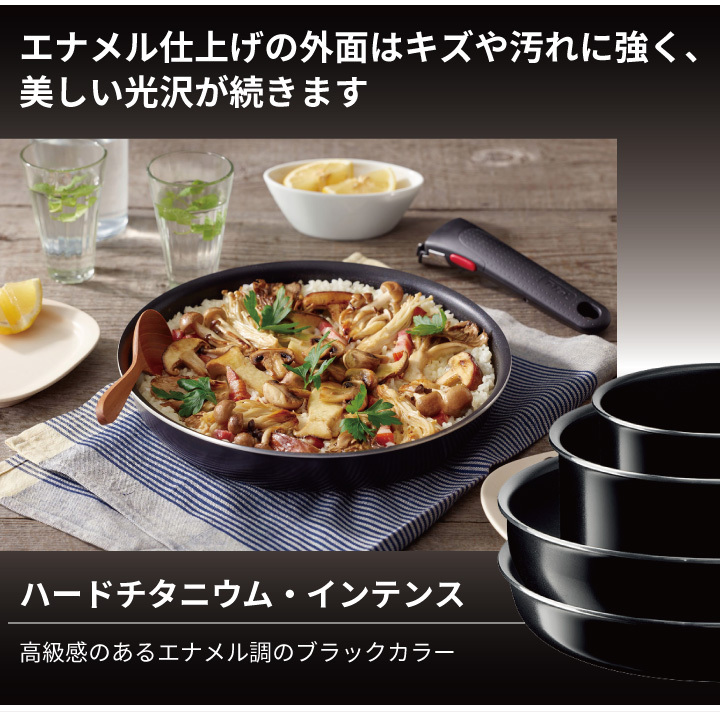 ●使い始めのこびりつきにくさが長く続く。 ●食材を入れるベストタイミングが 目で見て分かるお知らせマーク。 ●抜群の熱伝導で、ムラなく調理。 ●コンパクトに重ねて収納。 ●調理後アツアツのまま食卓へ。 ●余った料理はそのまま冷蔵庫へ。 ●オーブン、食洗機OK。 ●幅広い層に人気のスタイリッシュなマットブラック。 キズや汚れに強く、美しい光沢のエナメル仕上げ。 ※金属製のフライ返し等の調理器具は、コーティング面に キズをつけないよう角の丸いものをご使用ください。 |