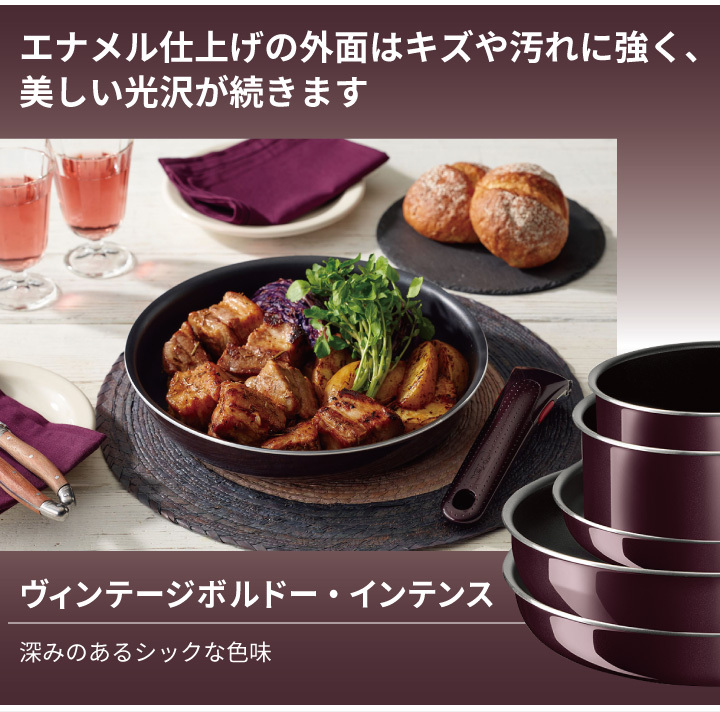 ●使い始めのこびりつきにくさが長く続く。 ●食材を入れるベストタイミングが 目で見て分かるお知らせマーク。 ●抜群の熱伝導で、ムラなく調理。 ●コンパクトに重ねて収納。 ●調理後アツアツのまま食卓へ。 ●余った料理はそのまま冷蔵庫へ。 ●オーブン、食洗機OK。 ●深みのあるシックなカラー。 キズや汚れに強く、美しい光沢のエナメル仕上げ。 ※金属製のフライ返し等の調理器具は、コーティング面に キズをつけないよう角の丸いものをご使用ください。 |