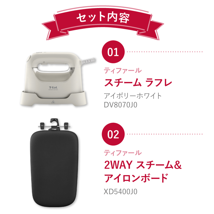 ・アイロン:スチーム ラフレ アイボリーホワイト DV8070J0…1個 ・アイロン台:2WAY スチーム&アイロンボード XD5400J0…1個 |