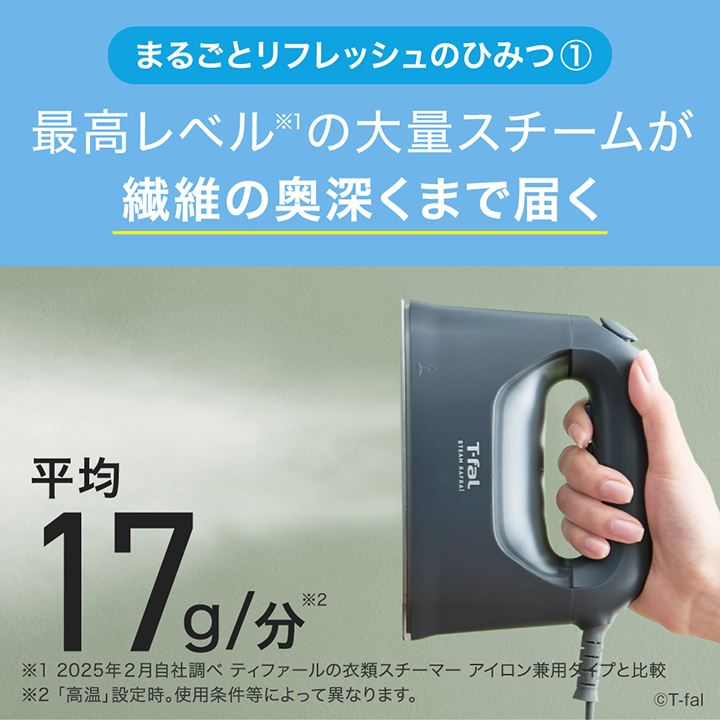 大量スチームで衣類、まるごとリフレッシュ! ●圧倒的なパワフルスチーム。 ●かけ面の幅が広く、すみずみまで熱とスチームが届く。 ●ダブル先細りチップの付いたかけ面(セラミック)。 ●指が疲れにくいワンプッシュおまかせスチーム。 ●360°どの角度でもスチームできる。 ●水量ち上が見やすい大容量タンク。 ●早い立ち上がり時間。 ●超軽量コンパクトボディ。 |