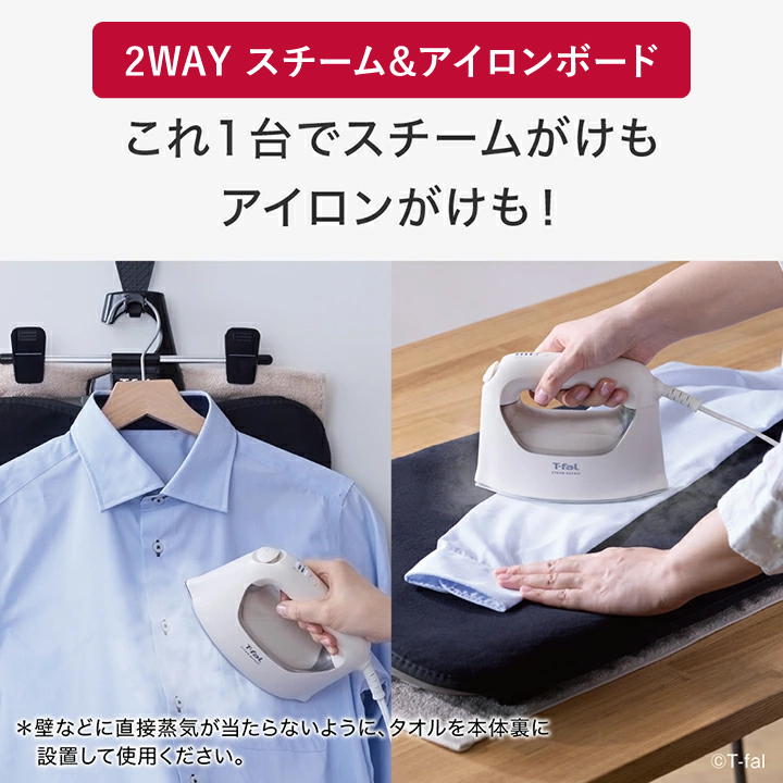 衣類スチーマーとアイロンの両方に使える2WAY仕様! ●衣類をハンガーに掛けたまま使える「ハンガーそのままフック」付き。 ●ドアに掛けても使える「専用ドアフック(付属品)」付き。 ●ボトムスにも使える「パンツクリップ」付き。 ●脚付きなので平置き時も安定して使える。 ●クローゼットなどに掛けて収納できる。 ●超軽量で出し入れもラクラク。 |