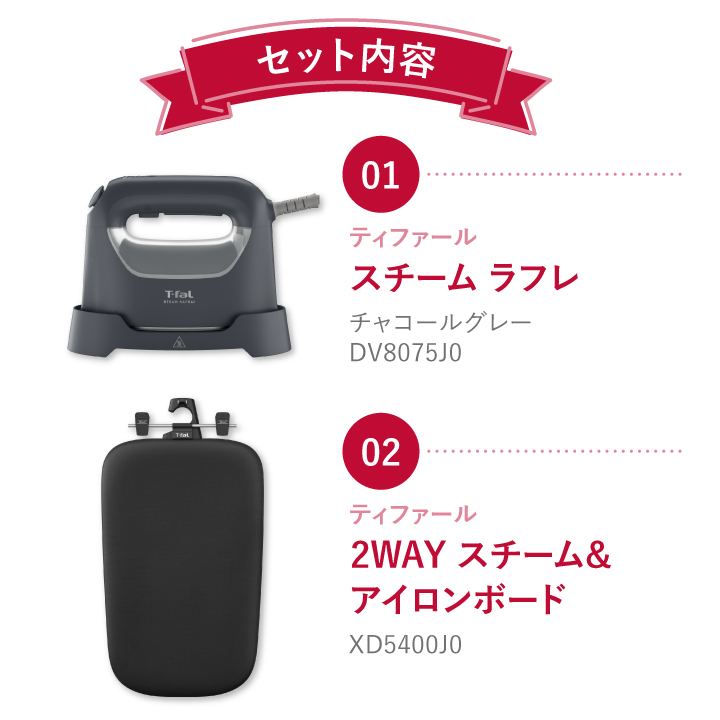 ・アイロン:スチーム ラフレ チャコールグレー DV8075J0…1個 ・アイロン台:2WAY スチーム&アイロンボード XD5400J0…1個 |