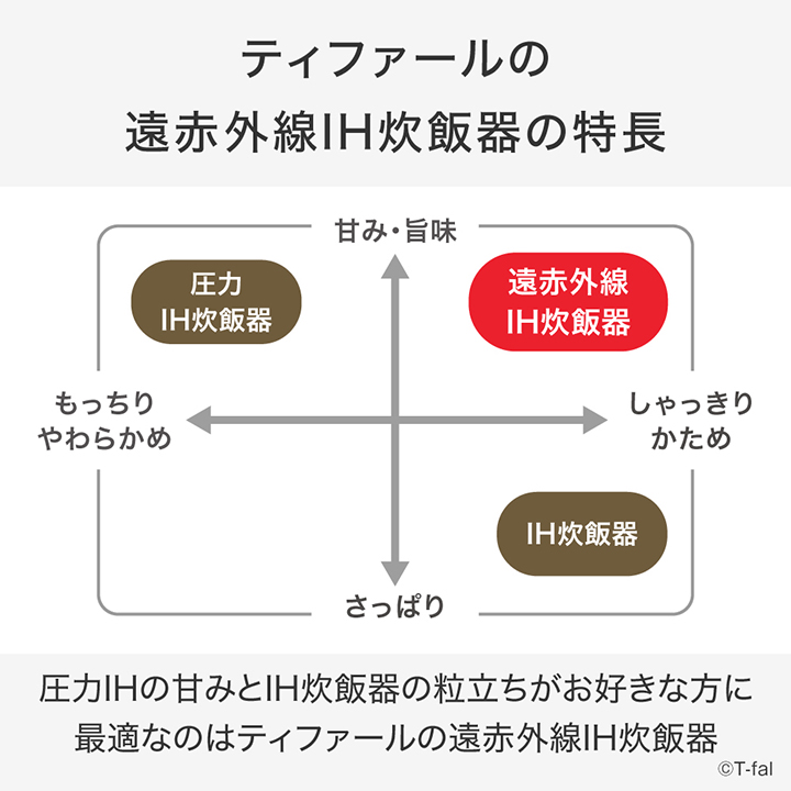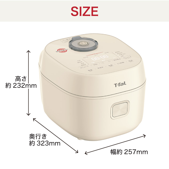 ●T-fal独自技法 遠赤外線×高火力IH! ・ふたには、新たに「セラミックプレート」を採用。 セラミックプレートをヒーターで熱し放出される「遠赤外線」と、 釜の下部からしっかりと包み込むように素早く加熱する「高火力IH」が 粒立ち、ハリ・甘みのあるおいしいご飯に炊き上げます。 ●ティファール独自の形状とこだわりの材質の釜で、さらに引き出すおいしさ! ・大きな熱対流を起こす炊飯に最適な球状釜。 ・発熱効率の良い「鉄」と熱伝導に優れた「アルミ」を組み込んだ、 蓄熱効果の高い約2mmの厚釜で、釜内を素早く均一に加熱します。 ・釜内面コーティングは3年保証(※)。 (※取扱説明書の記載事項に沿わない使い方をされた場合は対象外) ●毎日の炊飯に使いやすい炊飯プログラムは、 ・白米、無洗米、玄米、雑穀米、長粒米、炊き込み、冷凍ごはん、お粥の全8種類。 ・30分以内に炊き上げる「早炊き炊飯」&電気代節約につながる「エコ炊飯」搭載。 ・炊き具合は、やわらか、ふつう、かための3種類から選べます(※)。 (※白米・無洗米のみ。) ●お手入れもらくらく。 ・拭き取りやすいフルフラットトップパネル。 ・洗うパーツは内釜、鍋、蒸気口の3点だけ。 ・内ぶた、蒸気口(※)と付属のしゃもじ、カップは食洗機対応。 (※上部カバーは食洗機不可) ・炊き込みご飯を炊いた後などの気になる匂い残りを抑える「洗浄機能」搭載。 ●マットな質感でどんなキッチンにも合わせやすい、 ブラック・ホワイト・アイボリーの3色展開。 |