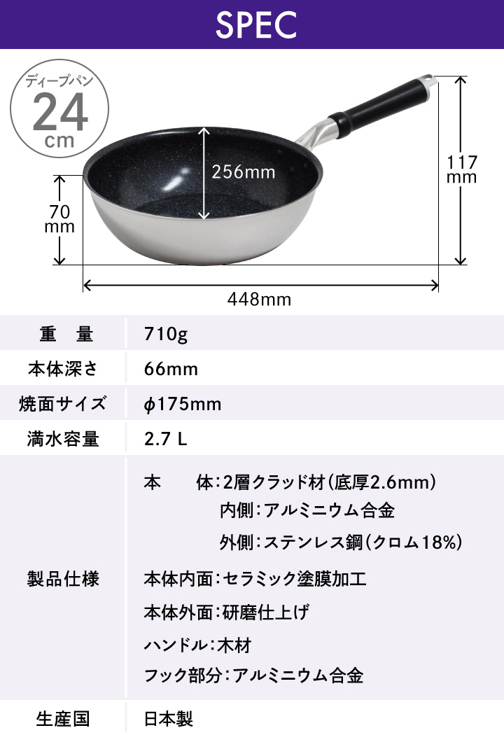 ●多用途で使える深型設計の日本製セラミックフライパン、