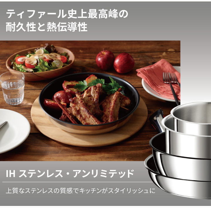 くらし屋オリジナルのお得な10点セット! ●ティファール史上最高峰のこびりつきにくさと耐久性! ・使い始めのこびりつきにくさが長く続きます。 ●優れた熱伝導で、食材の旨味を封じ込めます。 ●取っ手がとれて、使い方自由自在! ・そのままオーブンや冷蔵庫、食卓へ。 ・コンパクトに重ねて収納。 ●料理をもっとおいしくする「お知らせマーク」 ・食材を入れるベストタイミングが目で見て分かります。 ※フライパン・ソテーパンのみ ●上質なステンレスの質感がキッチンをスタイリッシュに! ※食器洗い機をご利用される場合は、食器洗い機および ご使用される洗剤の取扱説明書や使用上の注意を ご確認のうえ、従ってください。 ※金属製のフライ返し等の調理器具は、 コーティング面にキズをつけないよう 角の丸いものをご使用ください。 |