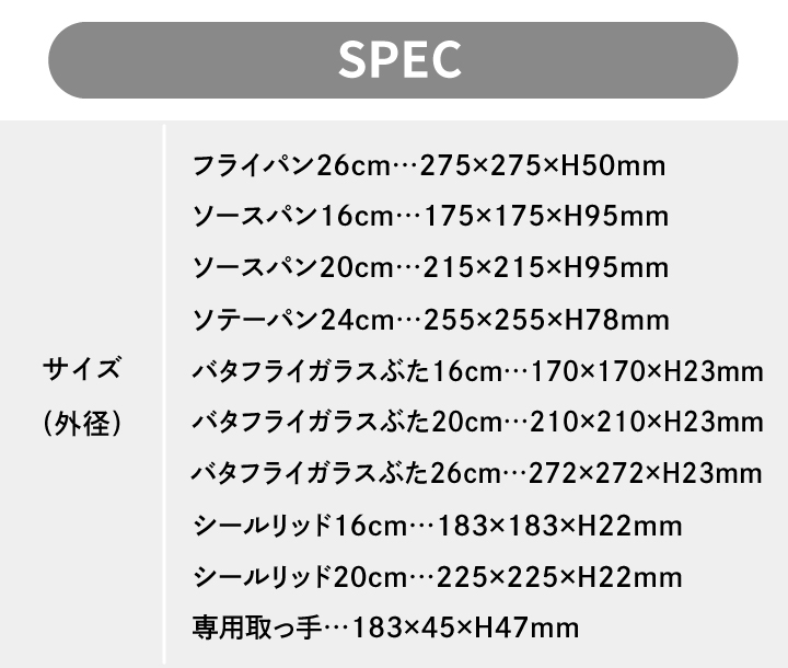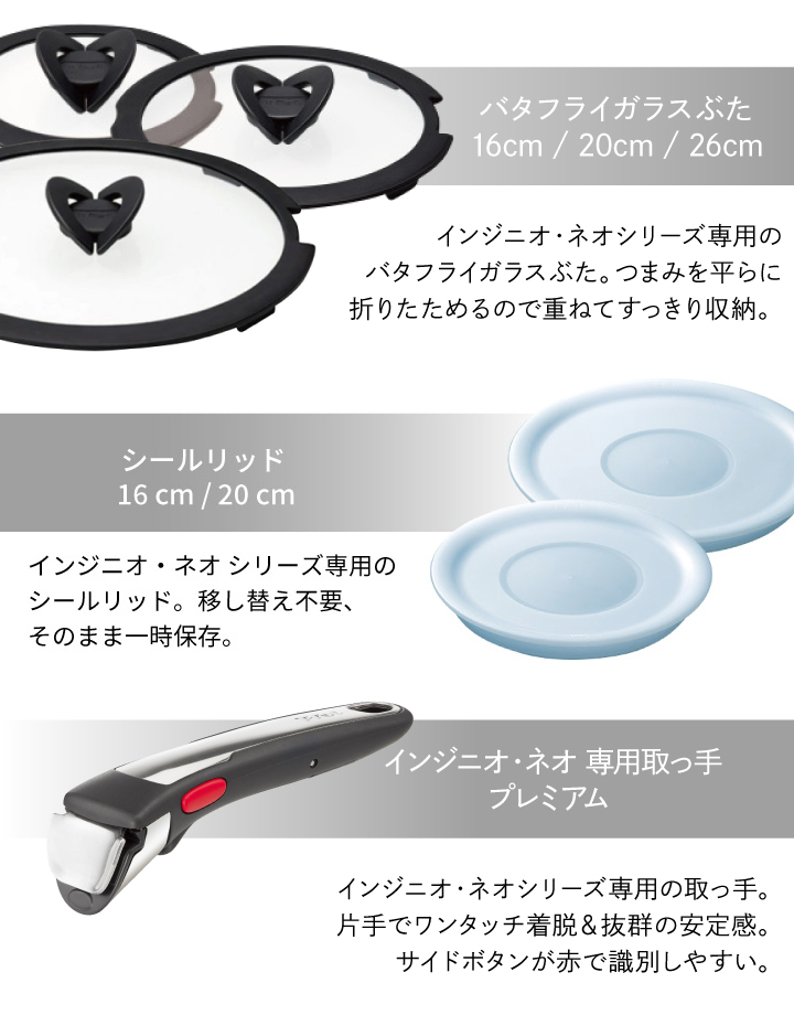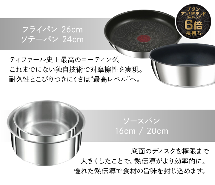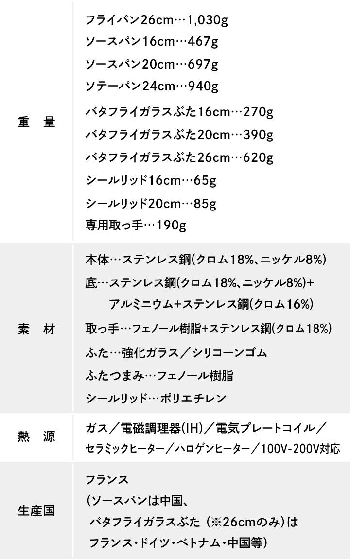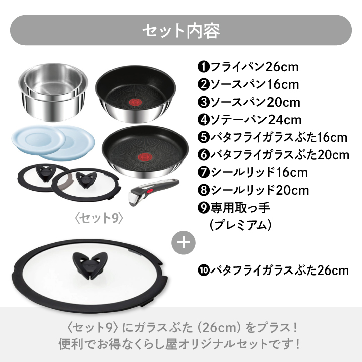 ・フライパン 26cm(チタン・アンリミテッド コーティング)…1個 ・ソースパン 16cm…1個 ・ソースパン 20cm…1個 ・ソテーパン 24cm(チタン・アンリミテッド コーティング)…1個 ・バタフライガラスぶた 16cm…1個 ・バタフライガラスぶた 20cm…1個 ・バタフライガラスぶた 26cm…1個 ・シールリッド 16cm…1個 ・シールリッド 20cm…1個 ・専用取っ手…1本 |