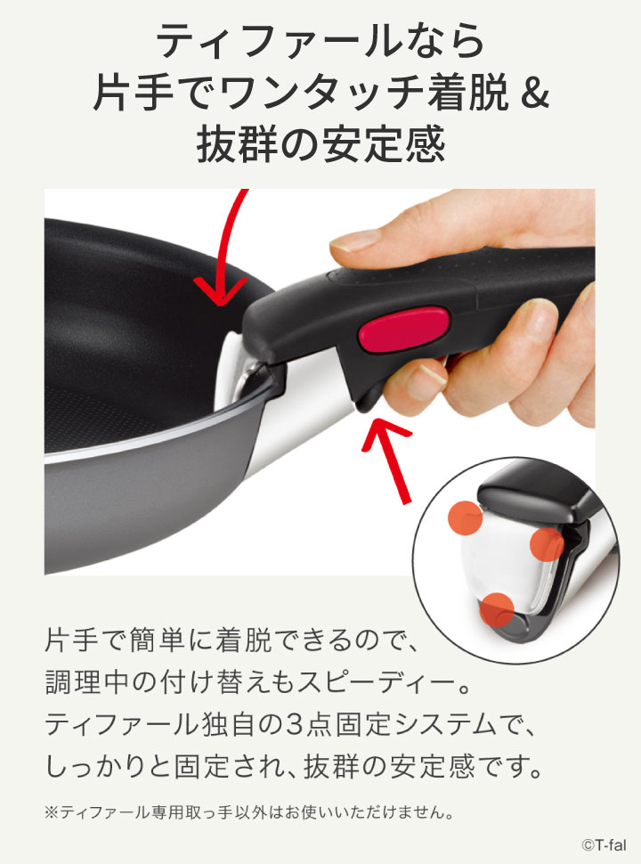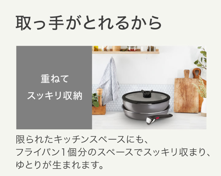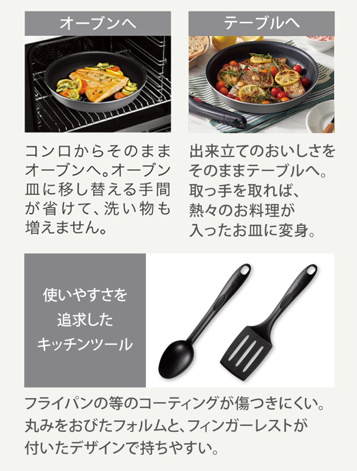 ●フライパンに加え、たっぷりの炒め物にも活躍するウォックパンや、 使いやすさを追求したキッチンツールが2点入った便利なセット。 これさえあれば、すぐに料理が始められます! ●取っ手がとれて、使い方自由自在! ・そのままオーブン、冷蔵庫、食卓へ。 ・コンパクトに重ねて収納。 ・らくらく丸洗い。 ●フライパン、ウォックパンは落ち着いたグレーのオンライン限定カラー。 ●「お知らせマーク」で食材を入れるベストタイミングが目で見て分かる。 ●耐久性が高く丈夫なチタン・コーティングで 使い始めのこびりつきにくさが長持ち。 ●片手で簡単に着脱できる専用取っ手。 ●調理中の中身が見やすいガラスぶた。 ●炒めたりソースをすくったり、盛り付けにも便利なスプーン。 ●お肉や野菜を炒めたり、具材を返すのに最適なターナー。 ●スプーン、ターナーはナイロン樹脂製なので、 フライパン等のコーティングを傷つけません。 ※こちらの商品はIH(電磁調理器)には対応しておりませんのでご注意下さい。 ※食器洗い機をご利用される場合は、食器洗い機およびご使用される洗剤の 取扱説明書や使用上の注意をご確認のうえ、従ってください。 ※金属製のフライ返し等の調理器具は、コーティング面に キズをつけないよう角の丸いものをご使用ください。 |