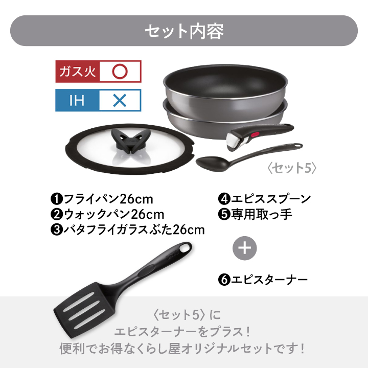 ・フライパン 26cm(チタン・コーティング)…1個 ・ウォックパン 26cm(チタン・コーティング)…1個 ・バタフライガラスぶた 26cm…1個 ・スプーン…1本 ・ターナー…1本 ・専用取っ手…1本 |