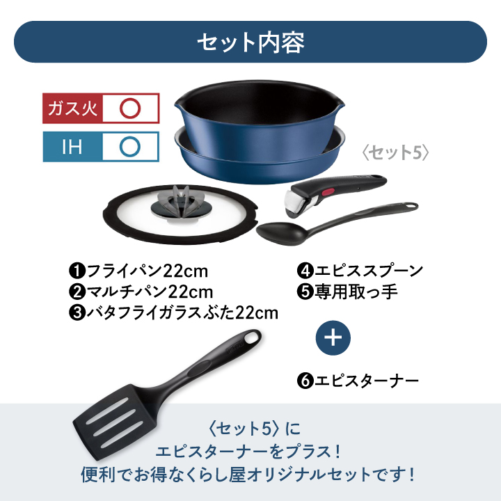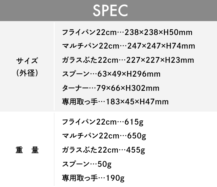 ・フライパン 22cm(チタン・アンリミテッド コーティング)…1個 ・マルチパン 22cm(チタン・アンリミテッド コーティング)…1個 ・バタフライガラスぶた 22cm…1個 ・スプーン…1本 ・ターナー…1本 ・専用取っ手…1本 |
