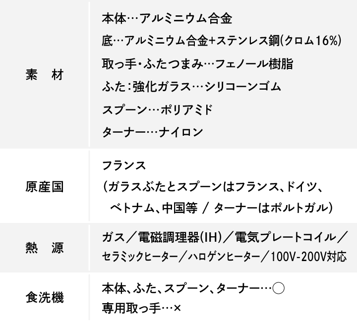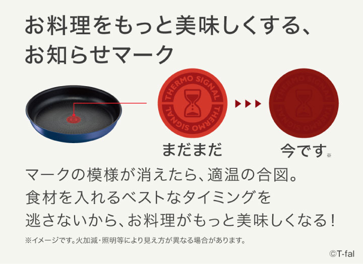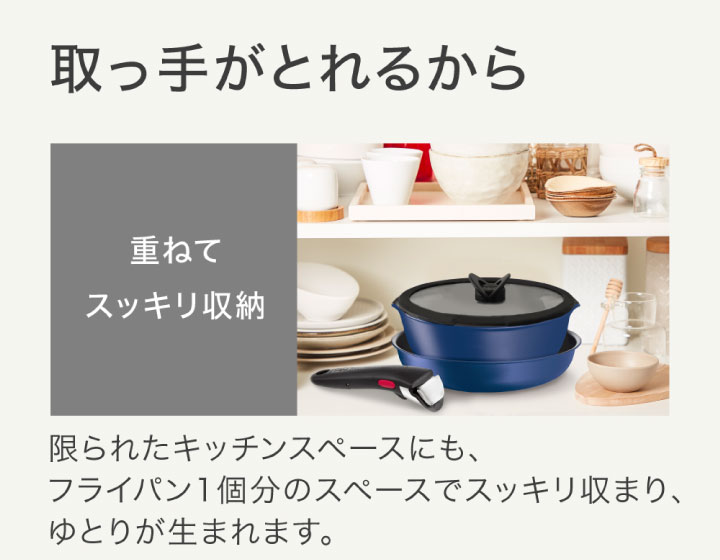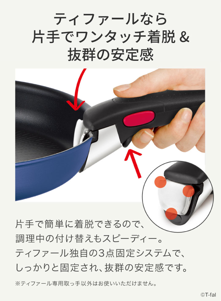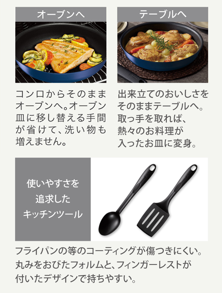 ●フライパンに加え、煮る・焼くなど幅広く使える深型のマルチパンや、 使いやすさを追求したキッチンツールが2点入った便利なセット。 これさえあれば、すぐに料理が始められます! ●取っ手がとれて、使い方自由自在! ・そのままオーブン、冷蔵庫、食卓へ。 ・コンパクトに重ねて収納。 ・らくらく丸洗い。 ●フライパン、マルチパンは鮮やかなブルーのオンライン限定カラー。 ●「お知らせマーク」で食材を入れるベストタイミングが目で見て分かる。 ●ティファール史上最高峰の耐久性を実現した チタン・アンリミテッドコーティングで、 使い始めのこびりつきにくさが長持ち。 ●片手で簡単に着脱できる専用取っ手。 ●調理中の中身が見やすいガラスぶた。 ●炒めたりソースをすくったり、盛り付けにも便利なスプーン。 ●お肉や野菜を炒めたり、具材を返すのに最適なターナー。 ●スプーン、ターナーはナイロン樹脂製なので、 フライパン等のコーティングを傷つけません。 ※食器洗い機をご利用される場合は、食器洗い機およびご使用される洗剤の 取扱説明書や使用上の注意をご確認のうえ、従ってください。 ※金属製のフライ返し等の調理器具は、コーティング面に キズをつけないよう角の丸いものをご使用ください。 |